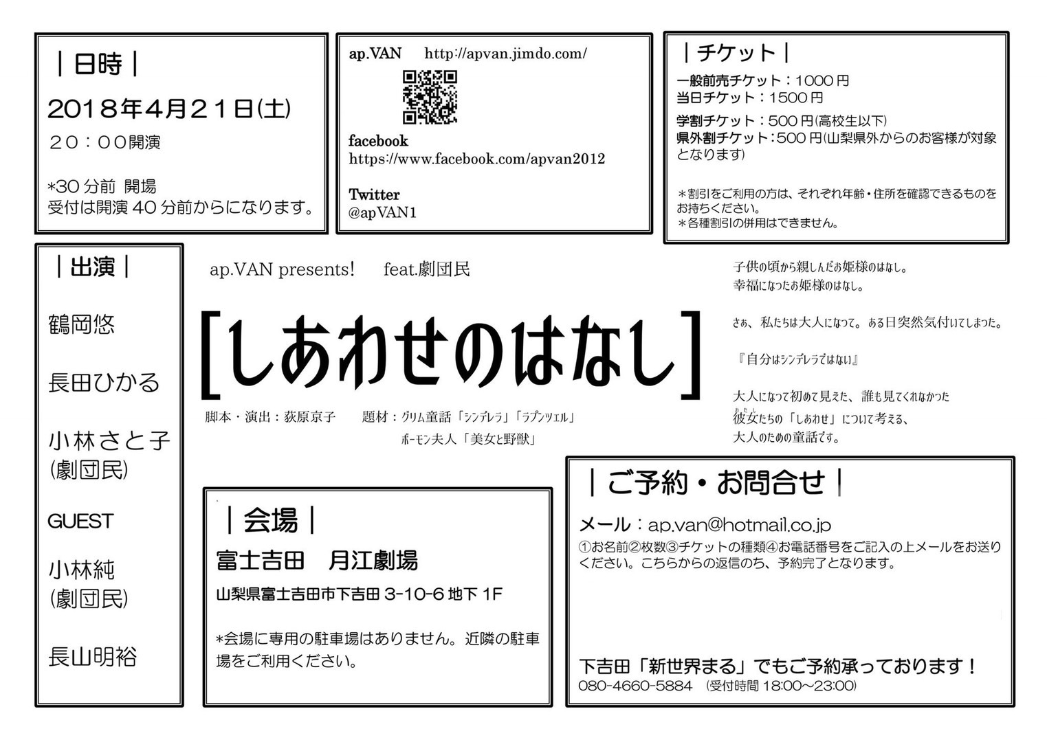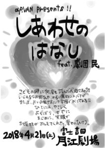 しあわせのはなし 題材:グリム童話「シンデレラ」「ラプンツェル」ボーモン夫人「美女と野獣」 脚本・演出:荻原京子 出演者:長田ひかる鶴岡 悠小林さとこ(客演) [第9回自主公演ver.]荻原京子樋貝考弘山本将広[feat.劇団 民ver.]小林 純長山明裕 公演:【第9回自主公演】2017年11月12日14:30〜 、18:00〜 【しあわせのはなしfeat.劇団 民】2018年4月21日20:00〜 内容:子どもの頃から親しんだお姫様のはなし。幸福になったお姫様のはなし。さぁ、大人になって。ある日突然気付いてしまった。『自分はシンデレラではない』大人になってもはじめて見えた、誰も見てくれなかった彼女(わたし)たちの「しあわせ」について考える、大人のための童話です。 2018年11月は自主公演として、甲府市「やまなしプラザ/オープンスクエア」で公演。2019年4月には「しあわせのはなしfeat.劇団 民」と題して、劇団民のお二人をお迎えし、一部キャストを変更して富士吉田市「月江劇場」で公演しました。 公演写真